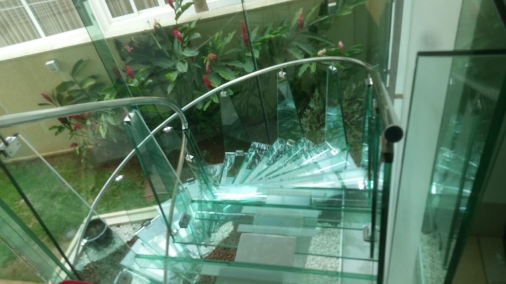 Os Vidros Especiais são ideais para quem gosta de ousar na decoração. A estatura metálica serve de base para cada degrau e sustenta praticamente toca a placa de vidro.
